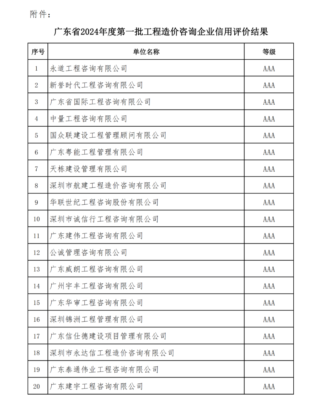 關(guān)于公布廣東省2024年度第一批工程造價(jià)咨詢企業(yè)信用評價(jià)結(jié)果的通知